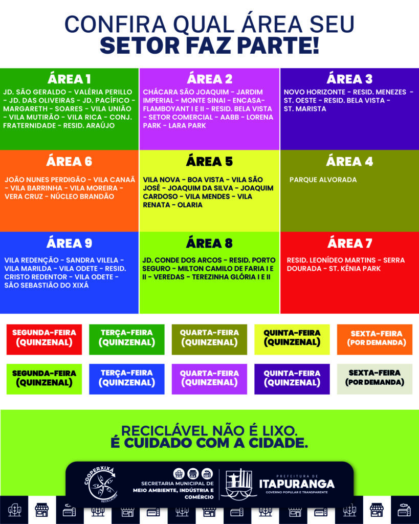 A coleta seletiva será realizada em dias específicos da semana, separados da coleta convencional. Os moradores devem colocar os materiais recicláveis na calçada até às 7h da manhã do dia programado para seu bairro.