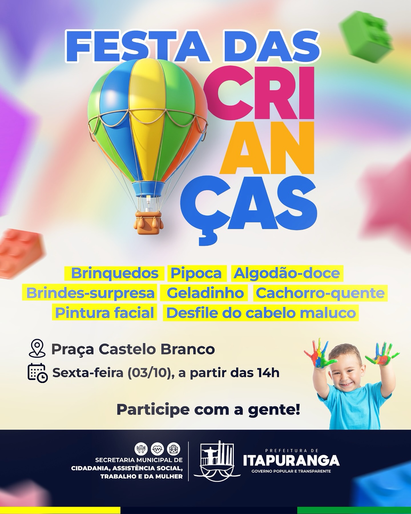 Vai ter brinquedos, pipoca, algodão-doce, cachorro-quente, geladinho, pintura facial, desfile do cabelo maluco e muito mais!