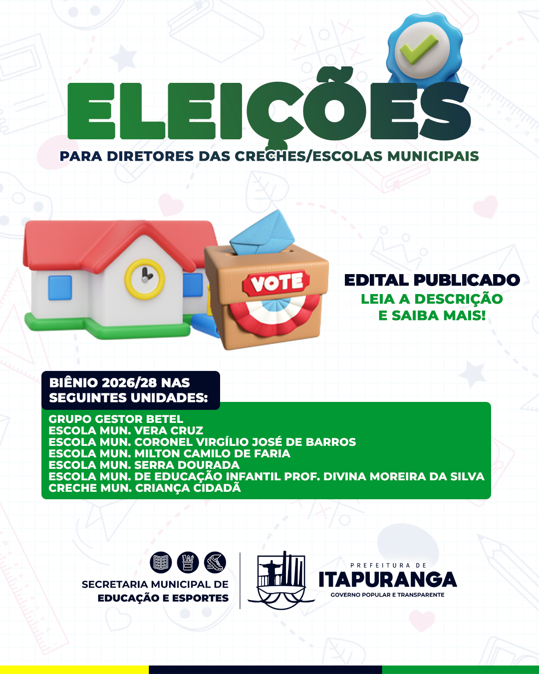 A Prefeitura de Itapuranga, por meio da Secretaria Municipal de Educação e Esportes, publicou o Edital de Convocação das Eleições para Diretores das Unidades Escolares da Rede Municipal de Ensino, que definirá os gestores escolares responsáveis pelo biênio 2026–2028.
