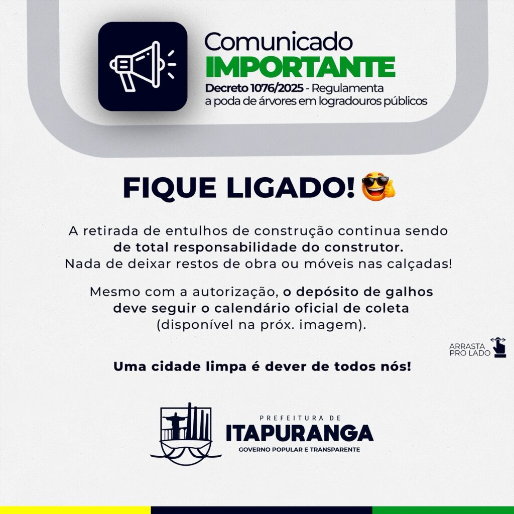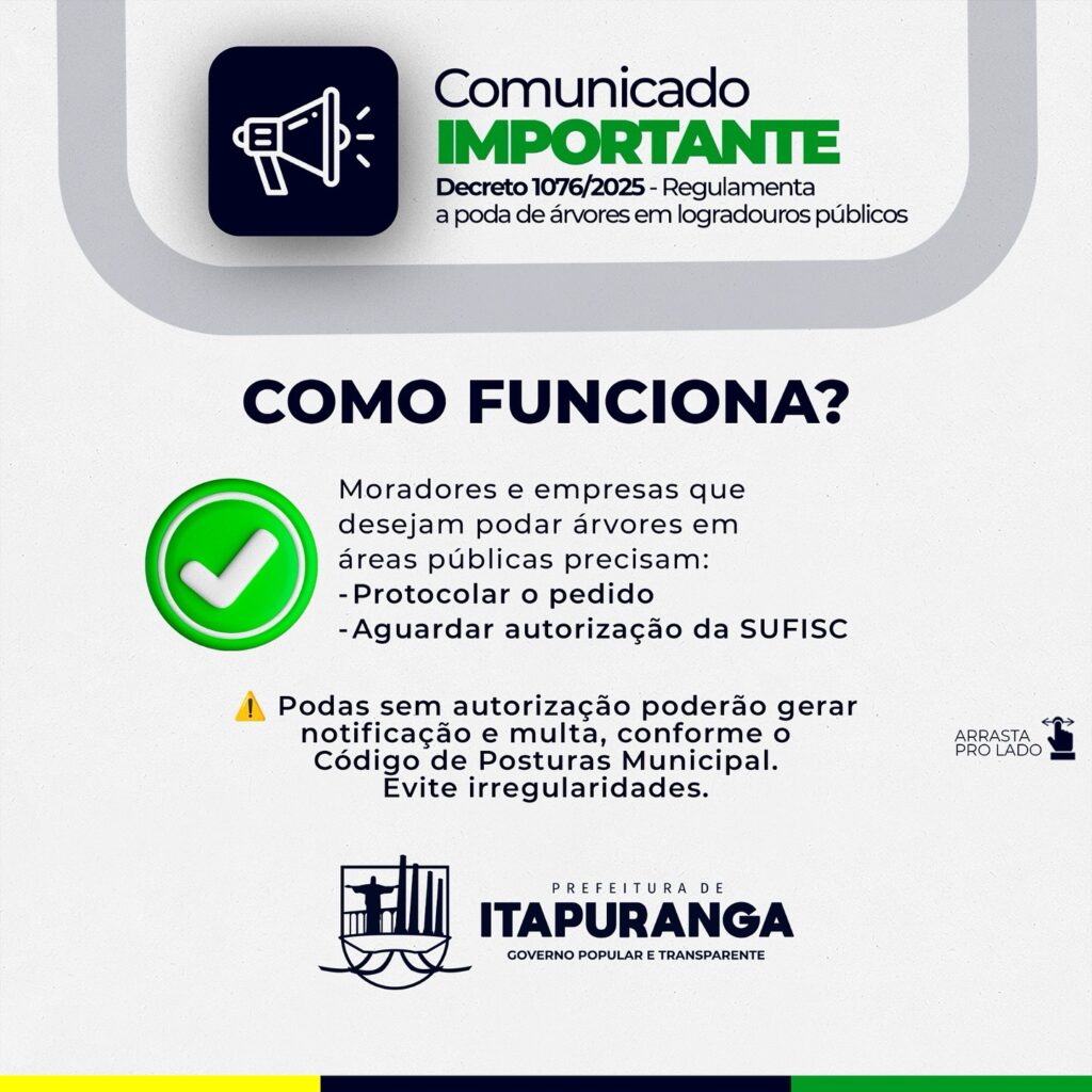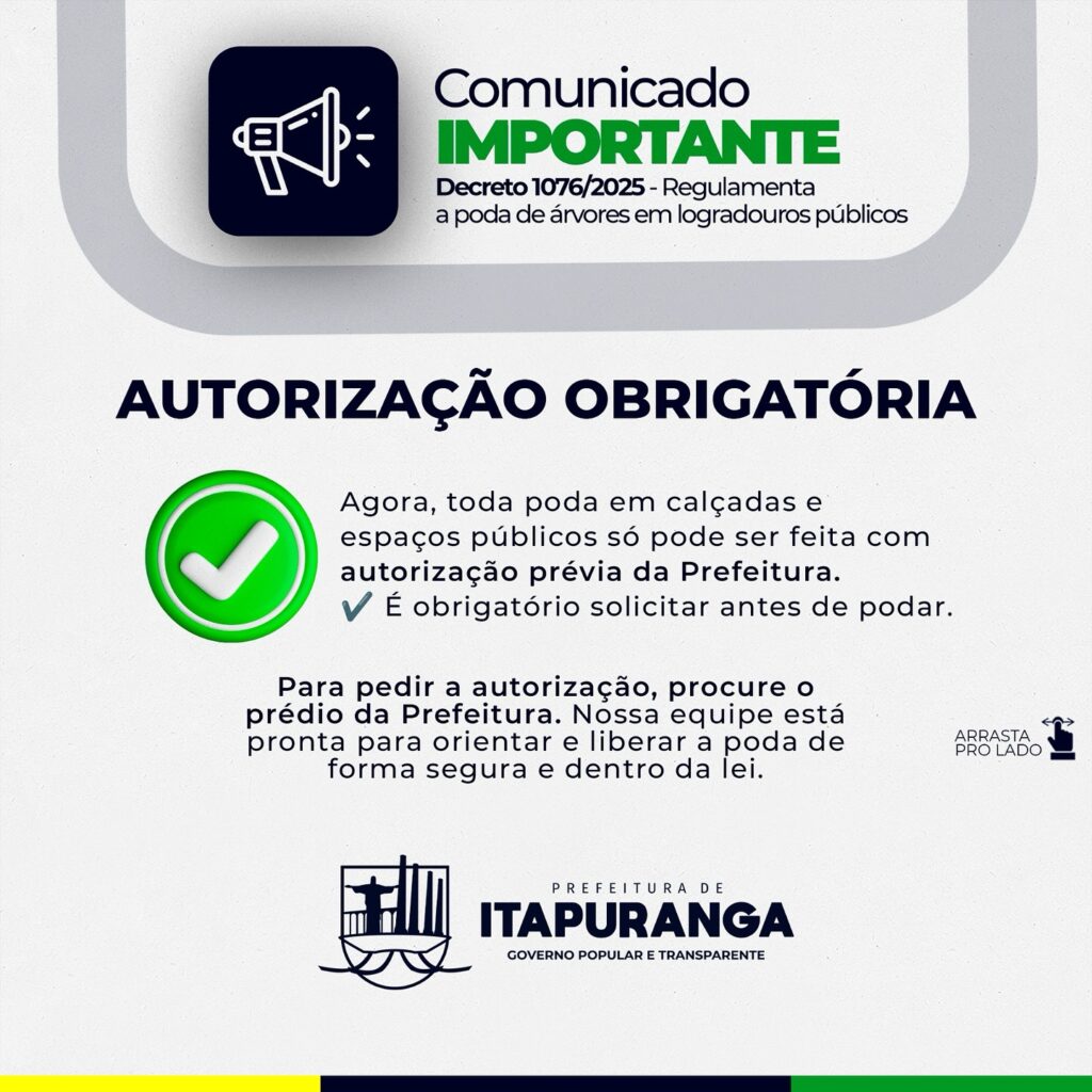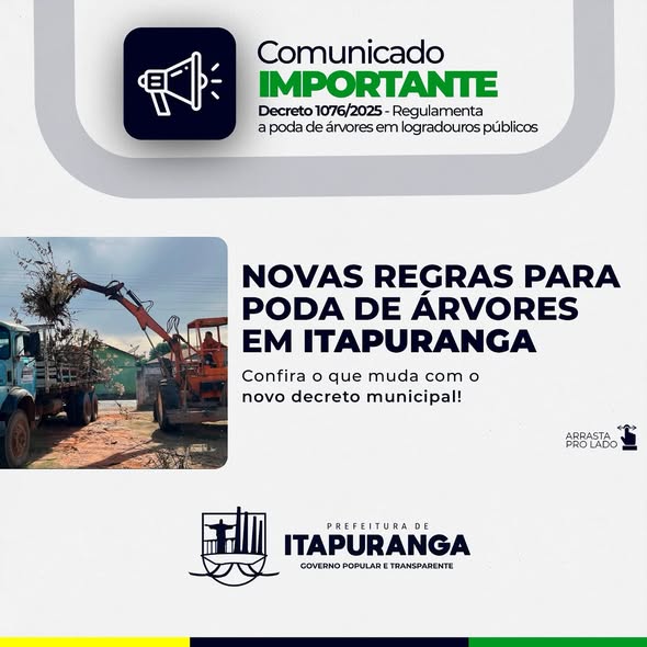 NOVAS REGRAS • A Prefeitura de Itapuranga publicou o Decreto 1076/2025, que regulamenta a poda de árvores em calçadas e demais espaços públicos do nosso município.