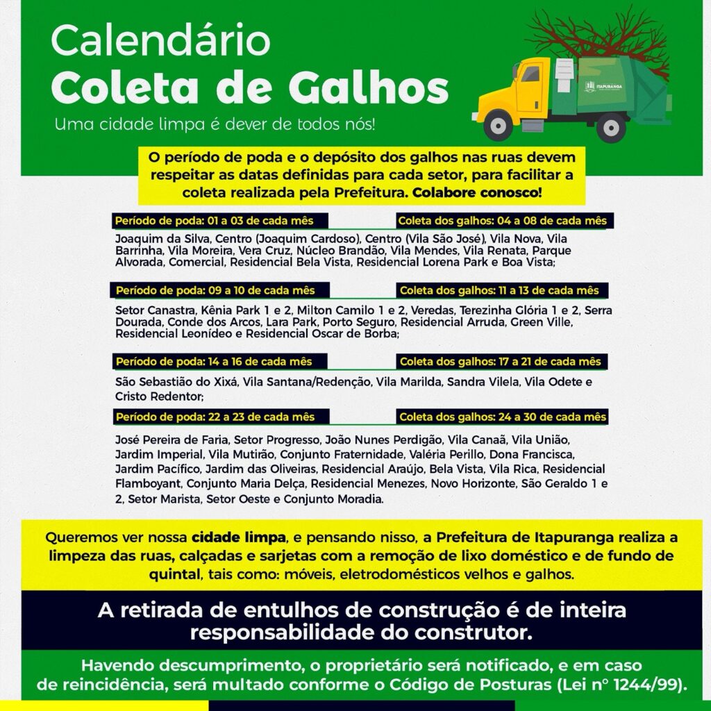 • O depósito de galhos deve seguir o calendário oficial de coleta.