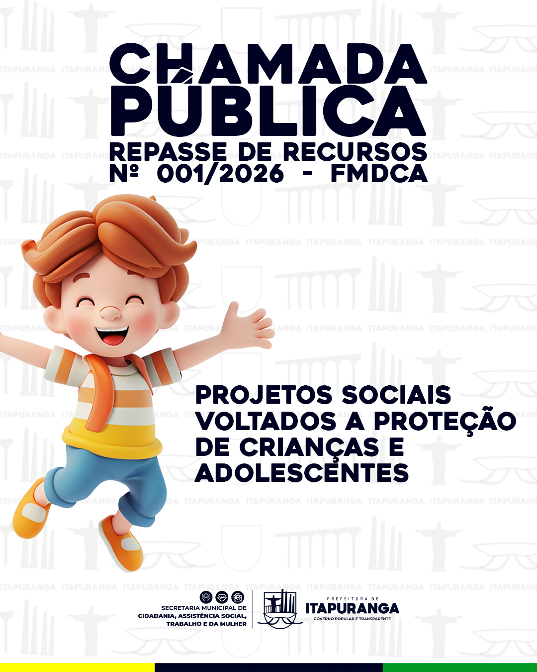 PREFEITURA DE ITAPURANGA ABRE INSCRIÇÕES PARA CHAMADA PÚBLICA VOLTADA A REPASSES PARA PROGRAMAS DE PROTEÇÃO DE CRIANÇAS E ADOLESCENTES.