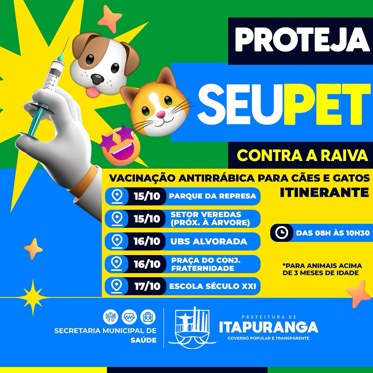 A equipe da Secretaria Municipal de @saude.itapuranga está realizando a imunização gratuita para cães e gatos acima de 3 meses de idade, sempre das 08h às 10h30. Confira os locais e datas