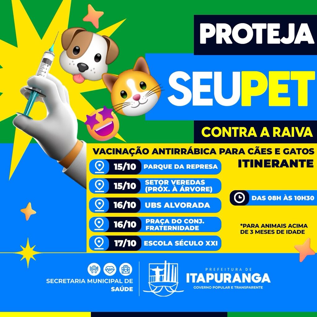 A equipe da Secretaria Municipal de @saude.itapuranga está realizando a imunização gratuita para cães e gatos acima de 3 meses de idade, sempre das 08h às 10h30. Confira os locais e datas